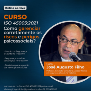 Promovam em suas organizações o Curso ISO 45003:2021 (Gestão de Saúde e Segurança Ocupacional – Saúde Ocupacional e Segurança no Trabalho), para capacitar as Lideranças, Gestores, RH, SESMT, Jurídico, Comitês, e outros setores envolvidos, pois irão precisar urgente (ministramos online ao vivo, in company, presencial e/ou semipresencial).